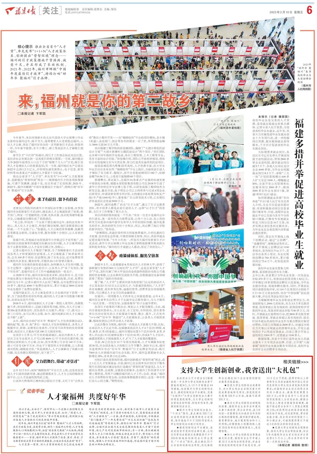 2月10日,福建日报刊发《支持大学生创新创业,我省送出“大礼包”》,聚焦省政府办公厅出台的《福建省进一步支持大学生创新创业若干措施的通知》,介绍了我省支持大学生创新创业出台的相关举措。