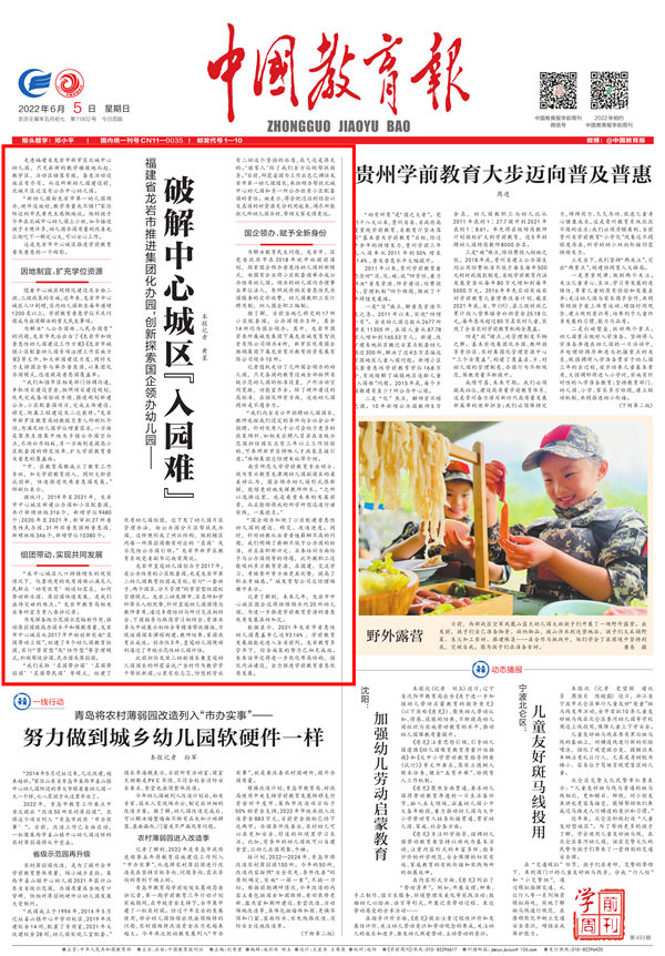 6月5日,中国教育报头版头条刊发《福建省龙岩市推进集团化办园,创新探索国企领办幼儿园——破解中心城区“入园难”》,介绍龙岩市破解中心城区“入园难”相关做法。