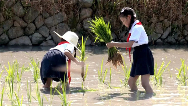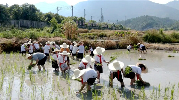 三明市沙县区实验小学在沙县中小学生劳动教育实践基地开展暑期亲子劳动实践活动,20多名不同年级的小学生在家长和老师的带领下进行劳动实践。孩子们在农民伯伯耐心的教导下学习插秧。他们脱掉鞋子,光着脚丫,争先恐后地下到农田里,弯着腰踩在泥浆里,一手攥秧把,一手插秧苗,大家热情高涨,尽管是第一次插秧苗,所插的秧苗也深浅不一、疏密不均,但通过大家的齐心努力,不一会儿一排排绿油油的秧苗便在田间遍布开来。